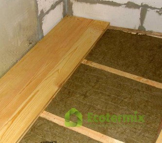 На лаги укладывают черновой настил из ДСП или сходных материалов, а на него – декоративное напольное покрытие. Чтобы не возникало эффекта «барабана», утеплитель должен обладать звукоизоляционными свойствами.